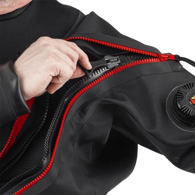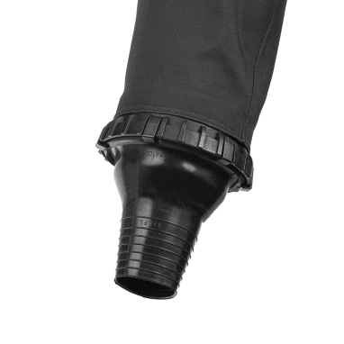 Front zip entry using a high quality YKK Aquaseal™ zipper is standard on the 901 series. An outer sheath with zipper gives added protection to the main zipper against wear and debris. The telescoping torso provides ease of donning and is held down by an integrated crotch strap.