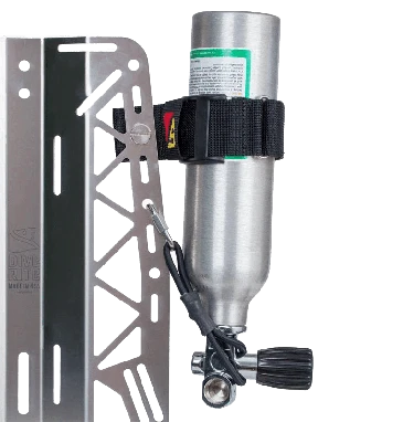 For divers who use argon gas for drysuit inflation or carry a small bottle of spare air, our Argon Bottle Mount carries one 6-cubic foot or one 13-cubic foot cylinder. Bottle mount attaches using a pair of stainless steel assembly screws (included) to the perimeter holes of metal backplates, or to the 1″ stainless steel D-rings on the perimeter of a Transpac harness. The Argon Bottle Mount can be attached to either side of the backplate or harness, behind the diver’s arm. A quick release buckle allows the bottle to be removed, if necessary, during a dive. Made in the USA.