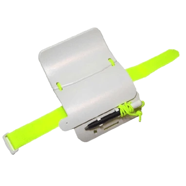 Slide it up your arm and two small elastic cords hold it firmly in place. Attached to the slate is a small pencil, which stows away in its own sleeve when not in use. It has not one, but three separate writing surfaces. The leaves flip up for easy access. When you are done writing, an elastic cord helps snap the leaves back in place.