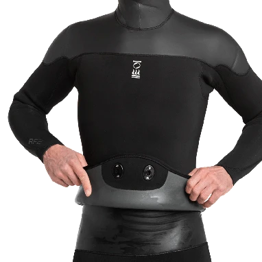 The RF2 Jacket has a tradition appearance, disguising the most advanced and developed features, designed for cold water freediving. The hood features a smothskin faceseal that eliminates water ingress, whilst the rest of the inner of the suit is ‘open cell’ Metalite neoprene, designed to maximise thermal protection and stretch.
