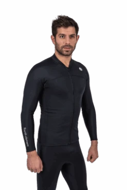 The convenience of the zip-thru jacket is that it is easy to don and quick to remove. The breathable fabric ensures that it is comfortable whilst preparing to dive and the design allows great freedom of movement along with the ability to unzip a little to keep cool before the dive. Pair this with the leggings to give full length neutrally buoyant thermal protection that dries quickly and is machine washable; always ready for next getting in the water.